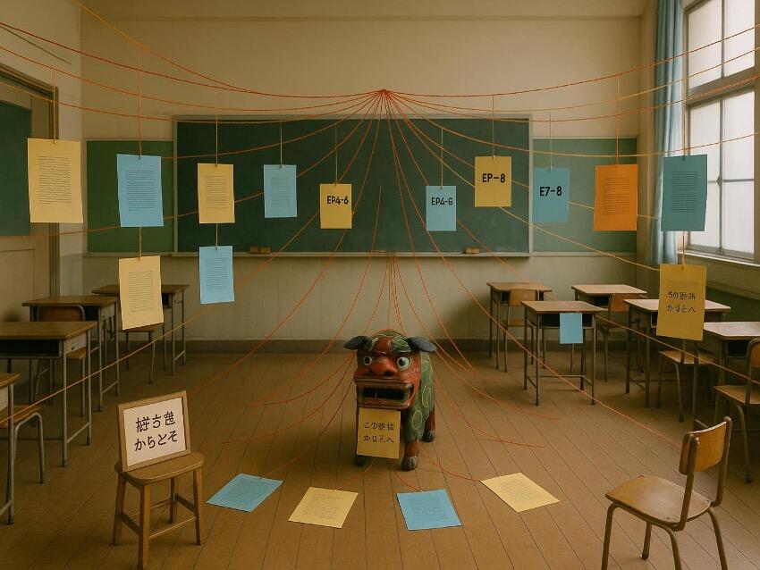 2024年の実験展においてブリキの獅子と原稿用紙を組み合わせた作品を展示