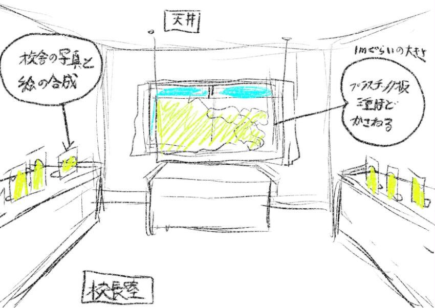 今回の紡ぐというテーマに応じてモノハウスで感じる自然と調和する校舎の雰囲気を絵にしようと思いました そして今回人や自然や動物、構造物あらゆる生き物が別のものではなく同じ生物として存在している感じが伝わればと思います