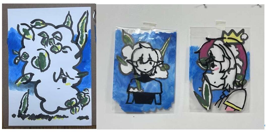 主に紙に絵を描いたもの サイズとしては大体 B5 前後の物が多い 紙のコラージュを透明なフィルムに入れ、そのフィルムの前後に絵を描いたもの