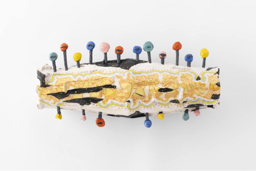 素材:陶土、ステンレスビス、下絵具、釉薬 作品キャプション 自作のキャラクターを絵付けすることで最低限の物語を与えること。 ランダムにかけた白化粧泥の流れや、刺した金属をそのまま焼くことで出来るテクスチャーなどで人為的以外のニュアンスを与えること。 をコンセプトにして、制作しました。